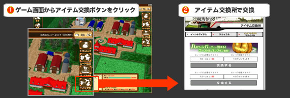 - ゲーム画面の、アイテム交換ボタンをクリック。