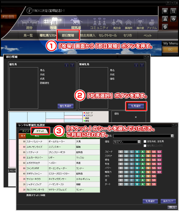 「牧場」にある「即日繁殖」より、「チケット専用画面」からお使いください。