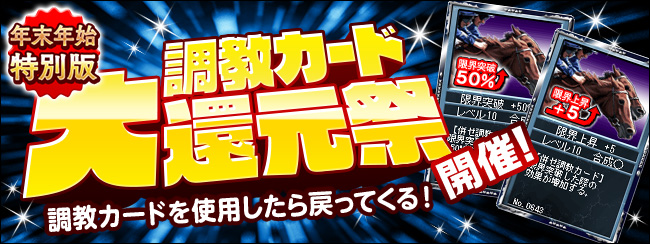 調教カードを使用すると 一定確率でご使用調教カードが返ってきます! 今回は年末年始特別版! 従来より調教カードの還元率が大幅アップとなります。