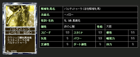 個性 闘神(レア) アビリティ ・ナタの切れ味(レア) ・ハイペースS(レア) ・超ロングスパート(レア) 系統 ミスタープロスペクター |
