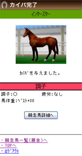 - 2. 引き続き調教を行う場合や、カイバを与える際は「競走馬詳細へ」ボタンを押してください。競走馬詳細画面に移動することができます。