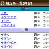- 1. 厩舎に入厩中の競走馬一覧が表示されますので、レースの出走登録を行いたい競走馬を選択します。