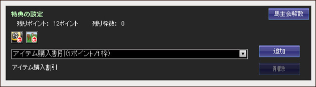 設定できる特典数には限度があり、その数が残り枠数で表示されています。特典の削除を行った場合、削除した特典の枠数が残り枠数に加算されます。残り枠数は馬主会のレベルアップによって増加し、最大で25枠となります。
